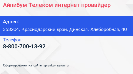 Айпибум Телеком, интернет-провайдер по адресу 353204, Краснодарский край, Динская, Хлеборобная, 40 в дальнейшем Организация, размещена в следующих категориях: