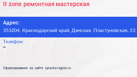 It-zone, ремонтная мастерская по адресу 353204, Краснодарский край, Динская, Пластуновская, 13 в дальнейшем Организация, размещена в следующих категориях: