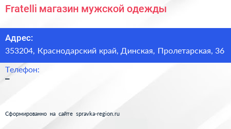 Fratelli, магазин мужской одежды по адресу 353204, Краснодарский край, Динская, Пролетарская, 36 в дальнейшем Организация, размещена в следующих категориях: