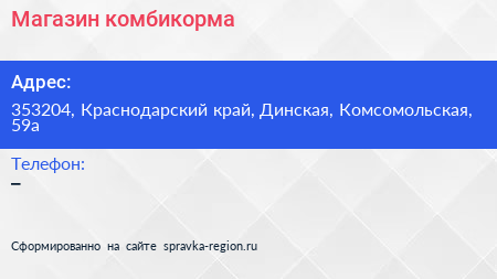 Магазин комбикорма по адресу 353204, Краснодарский край, Динская, Комсомольская, 59а в дальнейшем Организация, размещена в следующих категориях: