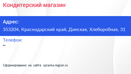 Кондитерский магазин по адресу 353204, Краснодарский край, Динская, Хлеборобная, 31 в дальнейшем Организация, размещена в следующих категориях: