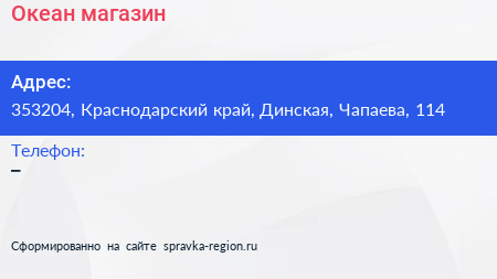 Океан, магазин по адресу 353204, Краснодарский край, Динская, Чапаева, 114 в дальнейшем Организация, размещена в следующих категориях: