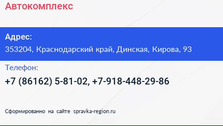 Автокомплекс по адресу 353204, Краснодарский край, Динская, Кирова, 93 в дальнейшем Организация, размещена в следующих категориях: