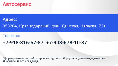 Автосервис по адресу 353204, Краснодарский край, Динская, Чапаева, 72а в дальнейшем Организация, размещена в следующих категориях: