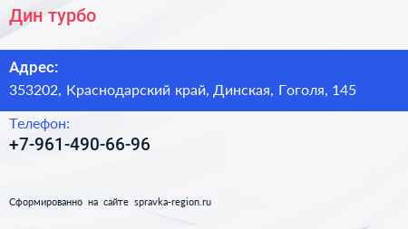 Дин турбо по адресу 353202, Краснодарский край, Динская, Гоголя, 145 в дальнейшем Организация, размещена в следующих категориях: