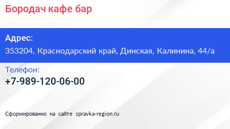 Бородач, кафе-бар по адресу 353204, Краснодарский край, Динская, Калинина, 44/а в дальнейшем Организация, размещена в следующих категориях: