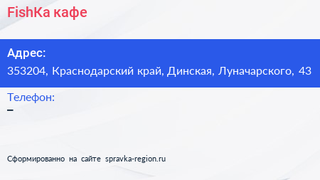 FishКа, кафе по адресу 353204, Краснодарский край, Динская, Луначарского, 43 в дальнейшем Организация, размещена в следующих категориях: