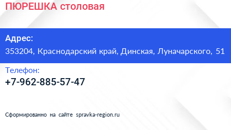 ПЮРЕШКА, столовая по адресу 353204, Краснодарский край, Динская, Луначарского, 51 в дальнейшем Организация, размещена в следующих категориях: