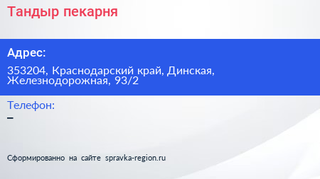 Тандыр, пекарня по адресу 353204, Краснодарский край, Динская, Железнодорожная, 93/2 в дальнейшем Организация, размещена в следующих категориях: