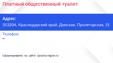 Платный общественный туалет по адресу 353204, Краснодарский край, Динская, Пролетарская, 31 в дальнейшем Организация, размещена в следующих категориях: