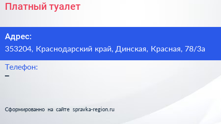 Платный туалет по адресу 353204, Краснодарский край, Динская, Красная, 78/3а в дальнейшем Организация, размещена в следующих категориях:
