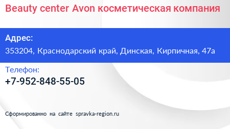 Beauty center Avon, косметическая компания по адресу 353204, Краснодарский край, Динская, Кирпичная, 47а в дальнейшем Организация, размещена в следующих категориях: