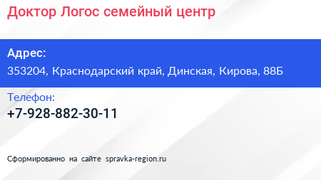 Доктор Логос, семейный центр по адресу 353204, Краснодарский край, Динская, Кирова, 88Б в дальнейшем Организация, размещена в следующих категориях: