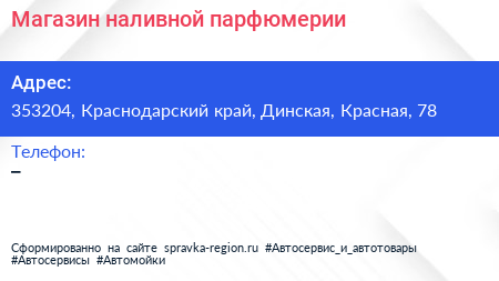 Магазин наливной парфюмерии по адресу 353204, Краснодарский край, Динская, Красная, 78 в дальнейшем Организация, размещена в следующих категориях: