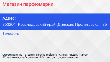 Магазин парфюмерии по адресу 353204, Краснодарский край, Динская, Пролетарская, 36 в дальнейшем Организация, размещена в следующих категориях: