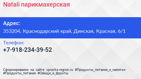 Natali, парикмахерская по адресу 353204, Краснодарский край, Динская, Красная, 6/1 в дальнейшем Организация, размещена в следующих категориях: