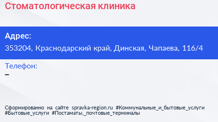 Стоматологическая клиника по адресу 353204, Краснодарский край, Динская, Чапаева, 116/4 в дальнейшем Организация, размещена в следующих категориях: