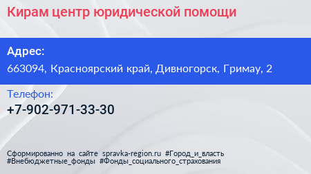Кирам, центр юридической помощи по адресу 663094, Красноярский край, Дивногорск, Гримау, 2 в дальнейшем Организация, размещена в следующих категориях: