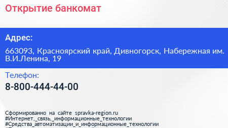 Открытие, банкомат по адресу 663093, Красноярский край, Дивногорск, Набережная им. В.И.Ленина, 19 в дальнейшем Организация, размещена в следующих категориях: