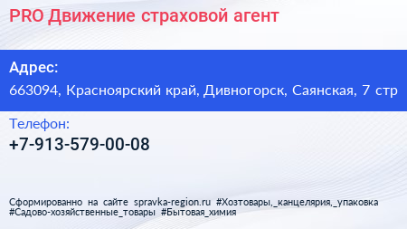 PRO..Движение, страховой агент по адресу 663094, Красноярский край, Дивногорск, Саянская, 7 стр в дальнейшем Организация, размещена в следующих категориях: