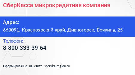 СберКасса, микрокредитная компания по адресу 663091, Красноярский край, Дивногорск, Бочкина, 25 в дальнейшем Организация, размещена в следующих категориях: