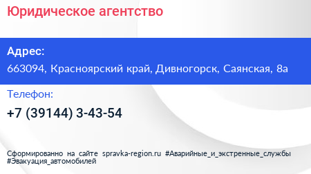 Юридическое агентство по адресу 663094, Красноярский край, Дивногорск, Саянская, 8а в дальнейшем Организация, размещена в следующих категориях: