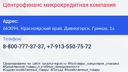 Центрофинанс, микрокредитная компания по адресу 663094, Красноярский край, Дивногорск, Гримау, 1а в дальнейшем Организация, размещена в следующих категориях:
