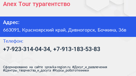 Anex Tour, турагентство по адресу 663091, Красноярский край, Дивногорск, Бочкина, 36в в дальнейшем Организация, размещена в следующих категориях: