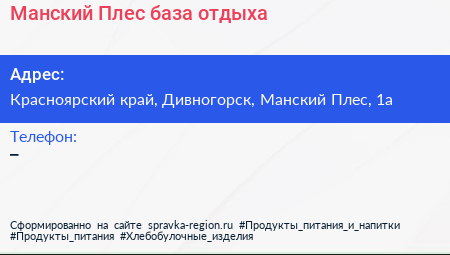 Манский Плес, база отдыха по адресу Красноярский край, Дивногорск, Манский Плес, 1а в дальнейшем Организация, размещена в следующих категориях: