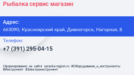 Рыбалка-сервис, магазин по адресу 663090, Красноярский край, Дивногорск, Нагорная, 8 в дальнейшем Организация, размещена в следующих категориях: