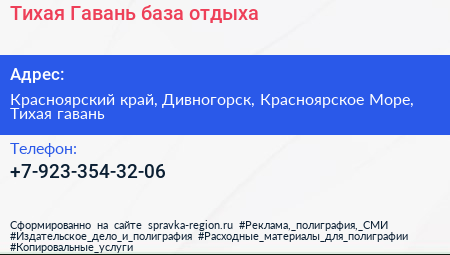Тихая Гавань, база отдыха по адресу Красноярский край, Дивногорск, Красноярское Море, Тихая гавань в дальнейшем Организация, размещена в следующих категориях: