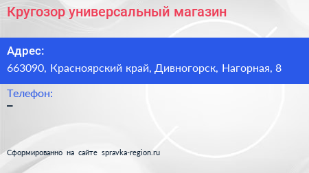 Кругозор, универсальный магазин по адресу 663090, Красноярский край, Дивногорск, Нагорная, 8 в дальнейшем Организация, размещена в следующих категориях: