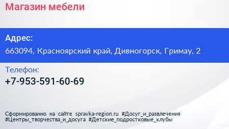 Магазин мебели по адресу 663094, Красноярский край, Дивногорск, Гримау, 2 в дальнейшем Организация, размещена в следующих категориях: