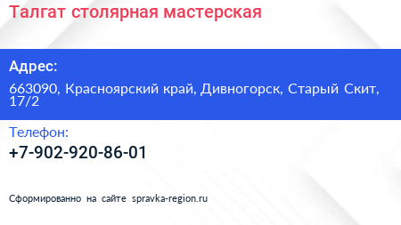 Талгат, столярная мастерская по адресу 663090, Красноярский край, Дивногорск, Старый Скит, 17/2 в дальнейшем Организация, размещена в следующих категориях: