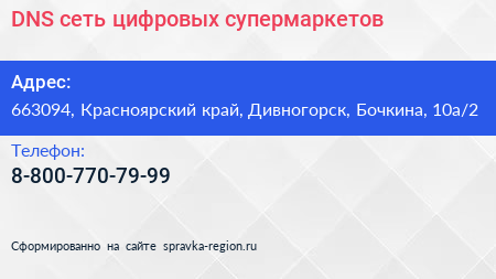 DNS, сеть цифровых супермаркетов по адресу 663094, Красноярский край, Дивногорск, Бочкина, 10а/2 в дальнейшем Организация, размещена в следующих категориях:
