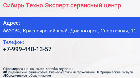 Сибирь Техно Эксперт, сервисный центр по адресу 663094, Красноярский край, Дивногорск, Спортивная, 11 в дальнейшем Организация, размещена в следующих категориях: