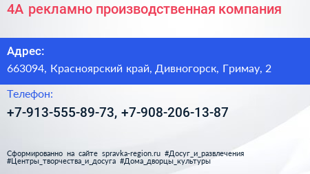4A, рекламно-производственная компания по адресу 663094, Красноярский край, Дивногорск, Гримау, 2 в дальнейшем Организация, размещена в следующих категориях: