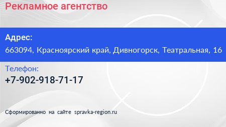 Рекламное агентство по адресу 663094, Красноярский край, Дивногорск, Театральная, 16 в дальнейшем Организация, размещена в следующих категориях: