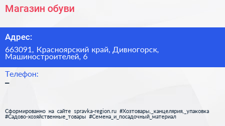 Магазин обуви по адресу 663091, Красноярский край, Дивногорск, Машиностроителей, 6 в дальнейшем Организация, размещена в следующих категориях: