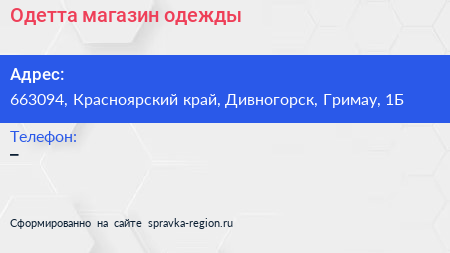 Одетта, магазин одежды по адресу 663094, Красноярский край, Дивногорск, Гримау, 1Б в дальнейшем Организация, размещена в следующих категориях: