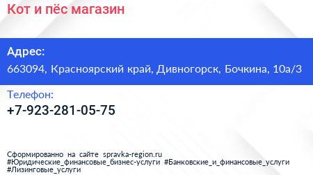 Кот и пёс, магазин по адресу 663094, Красноярский край, Дивногорск, Бочкина, 10а/3 в дальнейшем Организация, размещена в следующих категориях: