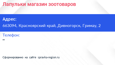 Лапульки, магазин зоотоваров по адресу 663094, Красноярский край, Дивногорск, Гримау, 2 в дальнейшем Организация, размещена в следующих категориях: