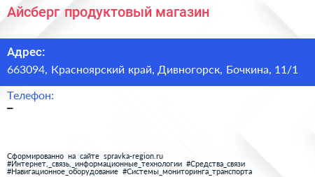 Айсберг, продуктовый магазин по адресу 663094, Красноярский край, Дивногорск, Бочкина, 11/1 в дальнейшем Организация, размещена в следующих категориях: