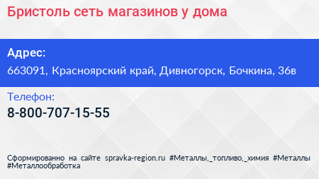 Бристоль, сеть магазинов у дома по адресу 663091, Красноярский край, Дивногорск, Бочкина, 36в в дальнейшем Организация, размещена в следующих категориях: