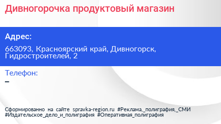 Дивногорочка, продуктовый магазин по адресу 663093, Красноярский край, Дивногорск, Гидростроителей, 2 в дальнейшем Организация, размещена в следующих категориях: