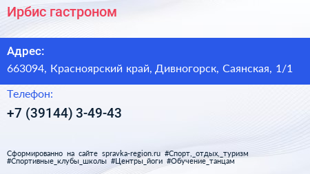 Ирбис, гастроном по адресу 663094, Красноярский край, Дивногорск, Саянская, 1/1 в дальнейшем Организация, размещена в следующих категориях: