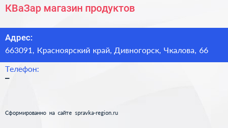 КВаЗар, магазин продуктов по адресу 663091, Красноярский край, Дивногорск, Чкалова, 66 в дальнейшем Организация, размещена в следующих категориях: