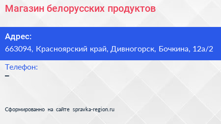 Магазин белорусских продуктов по адресу 663094, Красноярский край, Дивногорск, Бочкина, 12а/2 в дальнейшем Организация, размещена в следующих категориях: