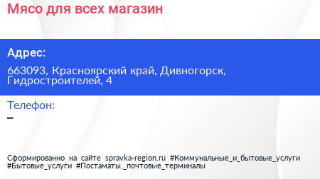 Мясо для всех, магазин по адресу 663093, Красноярский край, Дивногорск, Гидростроителей, 4 в дальнейшем Организация, размещена в следующих категориях: