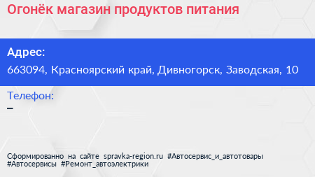 Огонёк, магазин продуктов питания по адресу 663094, Красноярский край, Дивногорск, Заводская, 10 в дальнейшем Организация, размещена в следующих категориях: